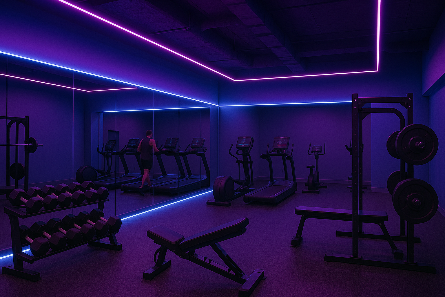 - Espaço de cardio (esteiras, bikes, remadores): pode contar com LED dinâmico e colorido, criando uma ambientação moderna e tecnológica.